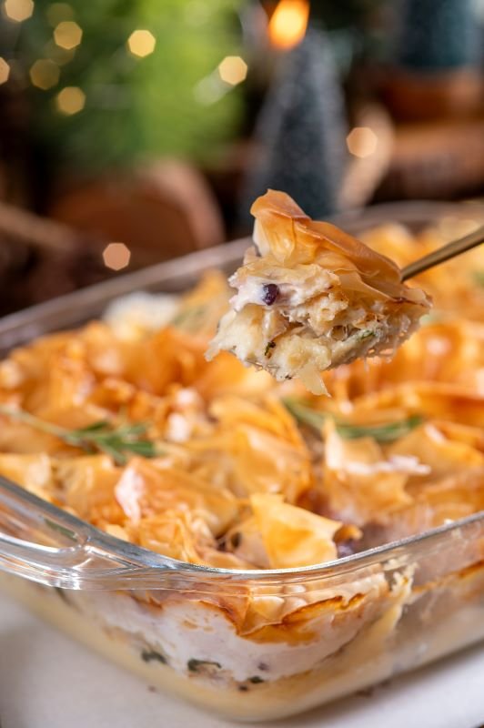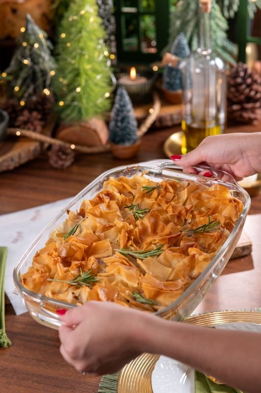 Este prato apresenta um delicado purê de batatas, aprimorado com lascas de bacalhau, ervas frescas e um cremoso creme de queijo. É coberto por molho béchamel aveludado e finalizado com folhas de massa filo, que, ao serem assadas, resultam em uma crosta dourada e crocante. Esta receita tradicional, ideal para tornar suas celebrações ainda mais especiais.