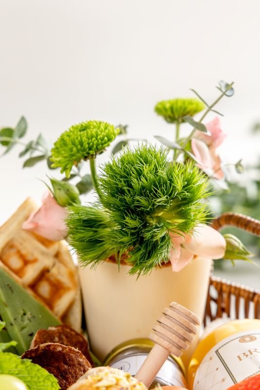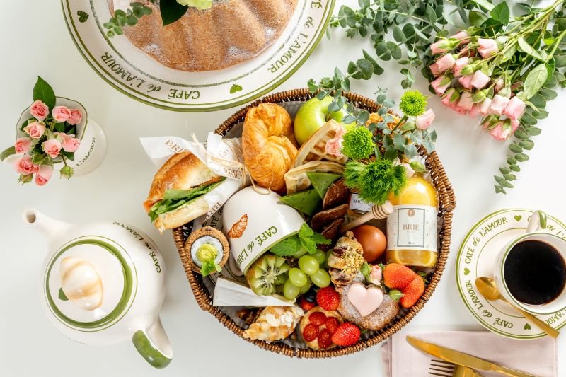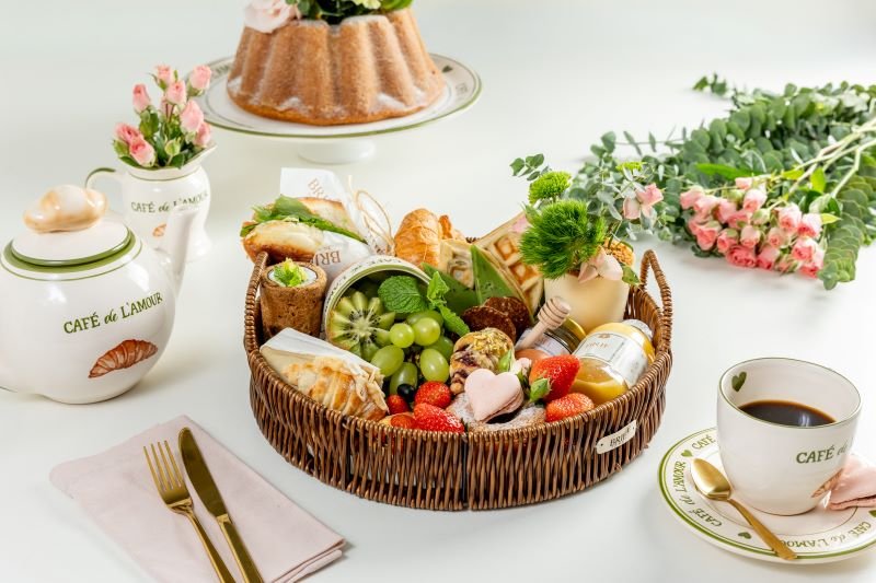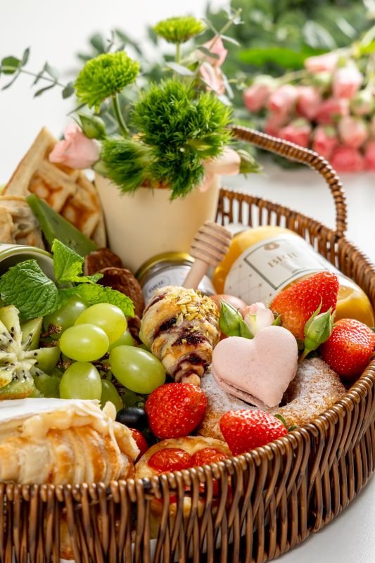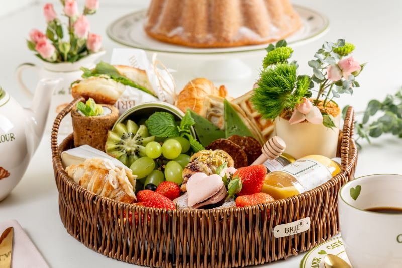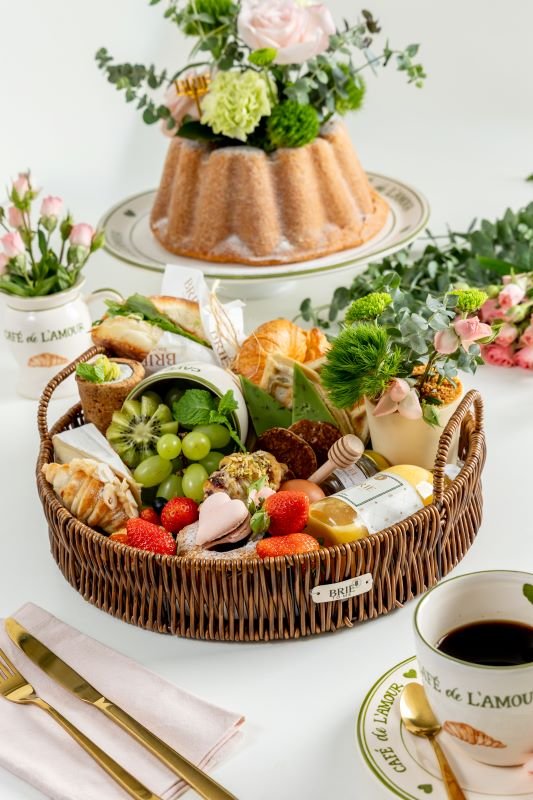 Composta por xícara com pires em porcelana Luiz Salvador; queijo Brie; Queijo Pesto Verde; sanduíche de salmão defumado com cream cheese rúcula; bolo amanteigado de laranja com toping de doce de leite argentino; vasinho de chocolate recheado com bolo, creme pâtisserie, abacaxi e flores; croissant; waffle; fatias de bolo de rolo; quiche caprese; minis croissants (chocolate, frutas vermelhas com pistache e amêndoas); copinho de cookie com parfait e ganache; frutas frescas; suco de tangerina (200 ml); mel com pegador de bambu e macaron.