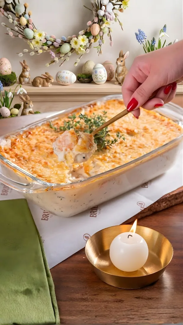 Camarões salteados e suculentos, envolvidos em um molho aveludado de queijo catupiry e béchamel, finalizados com uma camada de parmesão gratinado, que realça tanto o sabor quanto a cremosidade do prato.