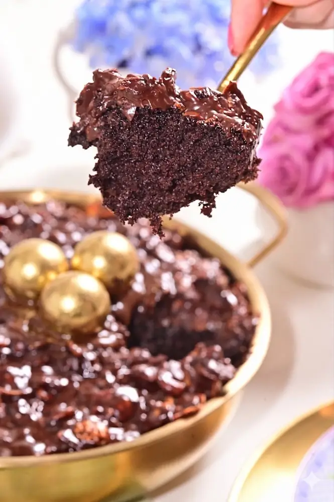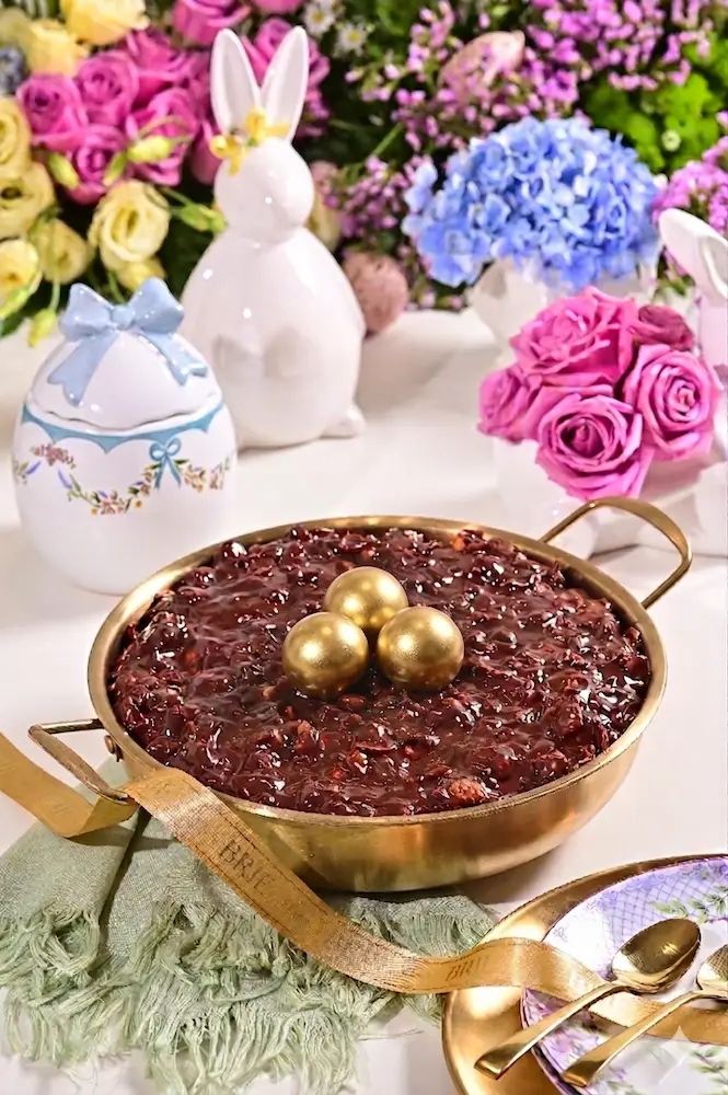 Bolo de chocolate servido em um charmoso tacho dourado, coberto com uma generosa camada de brigadeiro cremoso e crocante banhado em chocolate meio amargo. Finalizado com 3 brigadeiros gourmet para tornar o momento ainda mais especial. Serve até 10 pessoas.